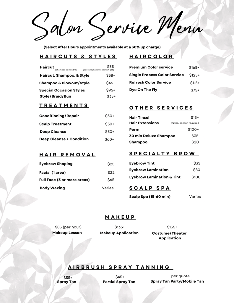 Service Menu Book Now! Click to schedule your appointment today! Share this: Share on X (Opens in new window) X Share on Facebook (Opens in new window) Facebook Like Loading...